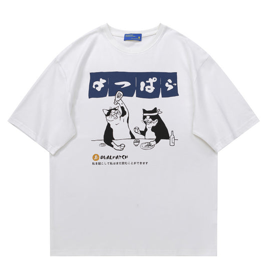 飲む猫プリント丸首Tシャツ