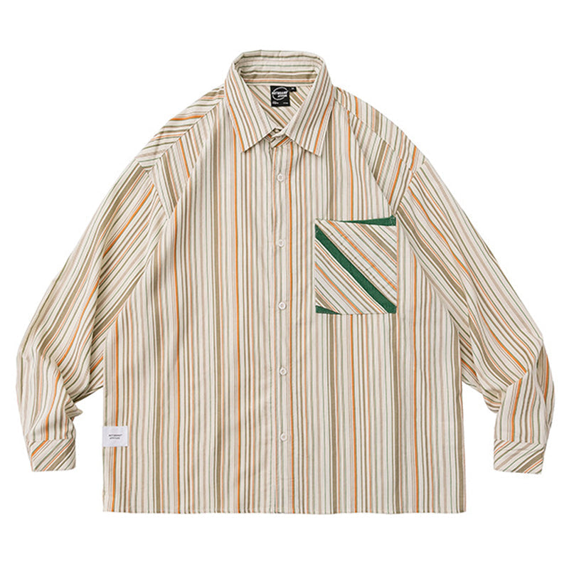 A blend of striped patterns with different color schemes and pitches. A combination of bright coloring and a striped pattern that blends smoothly into daily wear.