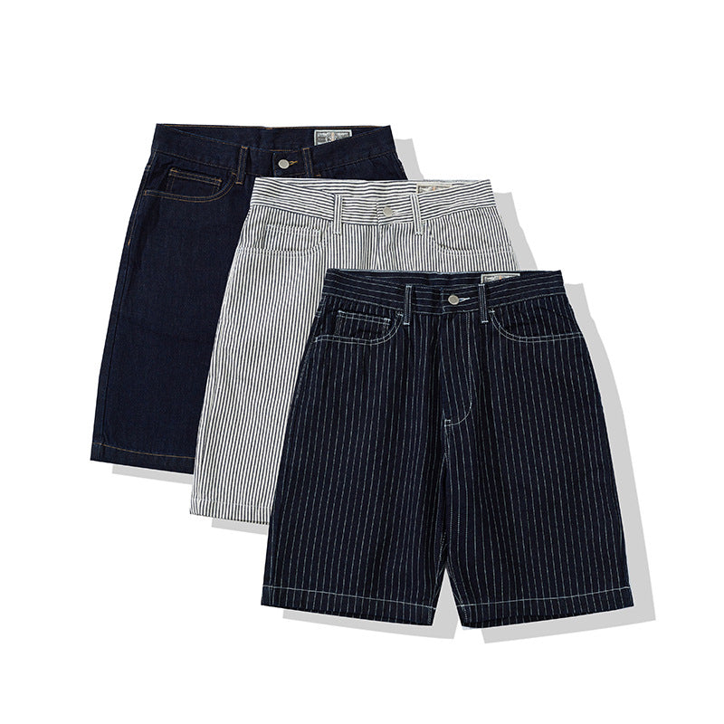 This item is inspired by the workwear worn by American railroad workers in the early 1900s, and incorporates details to improve the short design. These shorts have a classic silhouette and feature a striped pattern that has been dyed over and over. It makes your legs look more beautiful. Skilled craftsmen sew it with delicate and beautiful stitching, giving it an overall high quality feel.