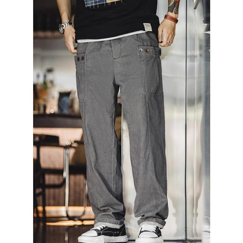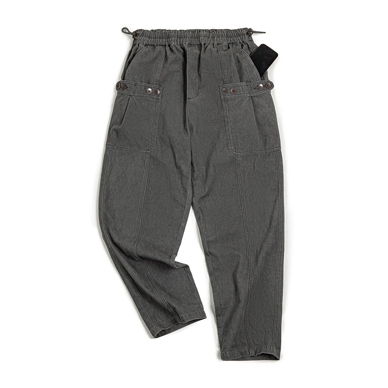 Introducing cargo pants made with an original ice dyeing process that creates a unique texture! Ice and dye are mixed and infused into the gray fabric, creating a shading pattern. The finished fabric exhibits irregular snowflake-like fading, which develops over time and depending on individual wear habits. The clean, straight silhouette, tapered slightly from the knee to the ankle, makes these pants easy to coordinate with many outfits. The length is adjustable, allowing you to wear them without turning up the hems. Attention to detail, including cargo pockets on both sides, antique bronze buttons, and a waist drawcord, adds to the texture.