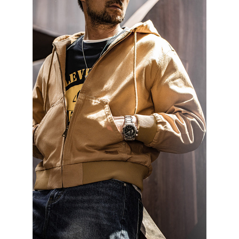 The cuffs and hem are ribbed to prevent wind from passing through, and the slightly shorter length and large hood, which are typical of work jackets, allow for a variety of styles and coordination options.