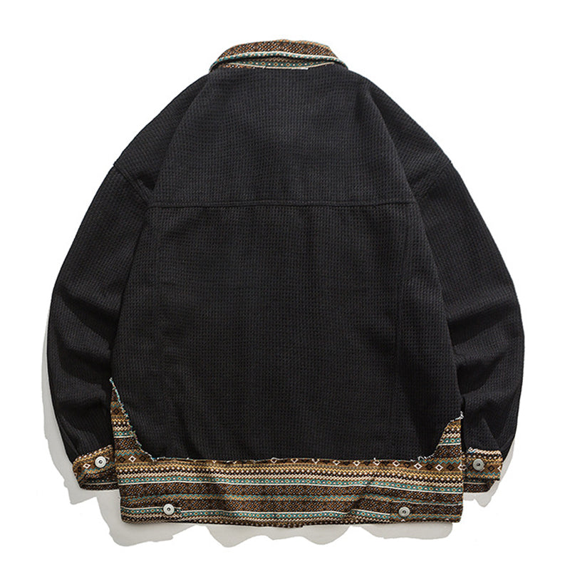 Introducing a jacket full of ethnic flair, crafted from waffle fabric! The exquisite waffle fabric and ethnic patchwork create a signature combination that's appealing, making this a cool piece that enhances the outdoor feel. The patchwork accents on the collar and hem are playful and make a statement piece that will become the focal point of your outfit. With its roomy armholes, width, and moderately dropped shoulders, this is sure to be a useful piece for layering styles this coming season. Wear it in your usual size, or choose a larger size for a big, oversized silhouette!