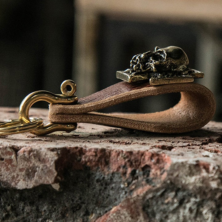 熟練の革職人が1つ1つ丁寧に作り上げたカウレザーと真鍮を組み合わせ、アクセサリーの中でも人気の髑髏シンボルを作ったキーホルダー。
