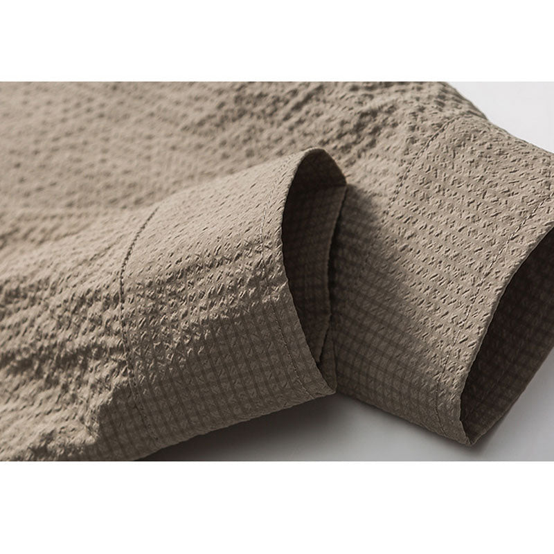 ポリエステルのシアサッカー生地です。洗濯後のアイロンも必要なく、使い勝手も抜群なアイテムになっています。日々のお手入れも簡単なイージーケアも魅力的、春夏の時期に快適に着用が可能なのが嬉しいポイント。