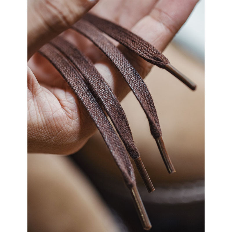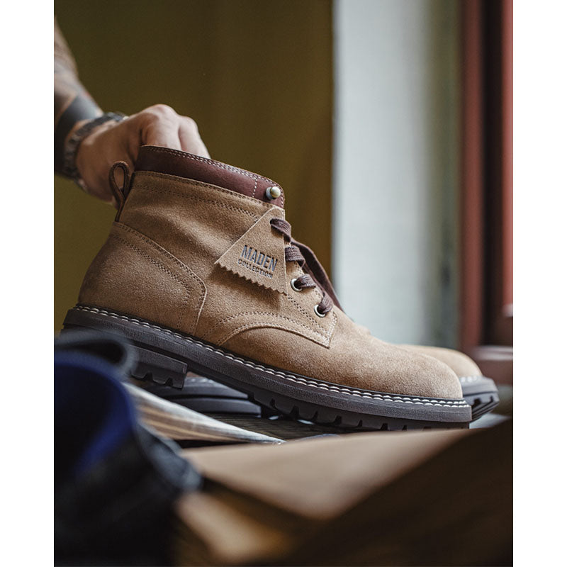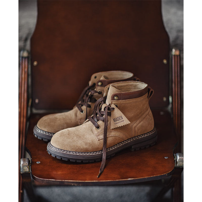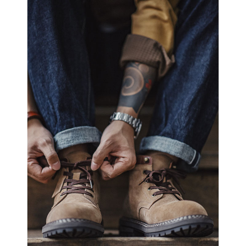 デザートブーツをベースに、自然のロックスをイメージしたカラーリングをリセットした、スエードと牛革トップレイヤーを採用、ちょっとワイルドなワークブーツです。コットンの平紐を特別に調合したワックスでコーティングしています。結ぶと固く締まってほどけ難くなるので、野戦用に適していました。バイカースタイルにはもちろん、レトロなスタイルにも最適。長年愛用できる時代に左右されないデザインなのが魅力の一足です。