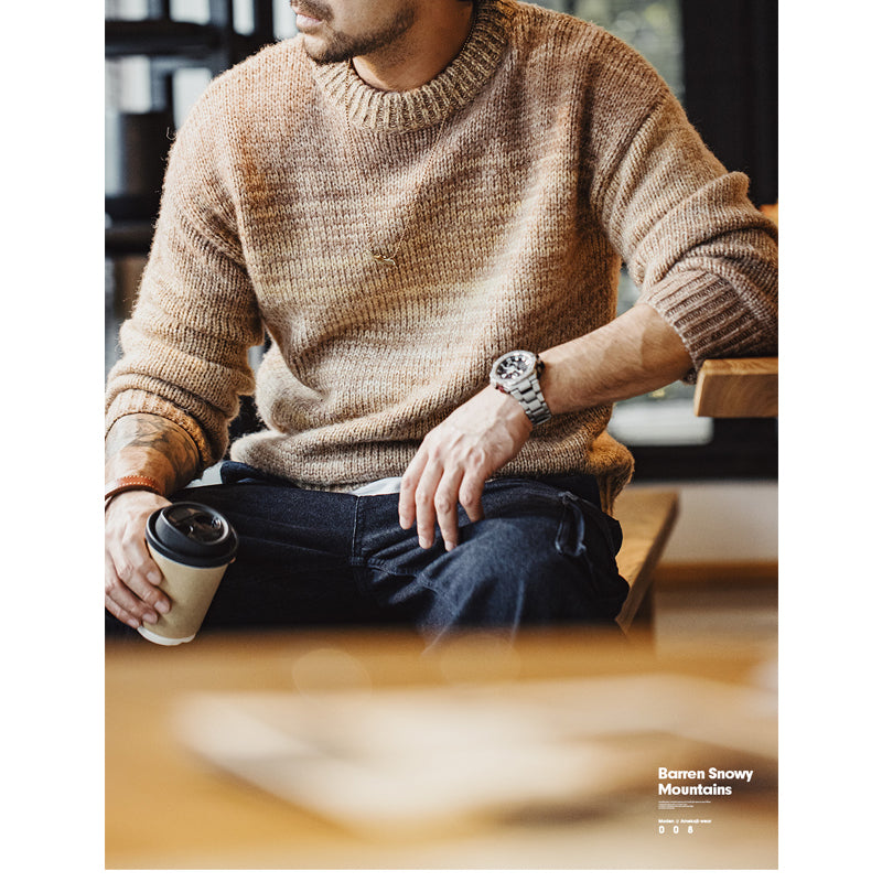 グラデーションデザインが特徴で、色彩が徐々に変化する効果であり、このセーターでは上部から下部にかけて色味が滑らかに変化していく。上部は濃い色で始まり、徐々に薄い色へと移行していくなど、美しい色の移り変わりが見られる。